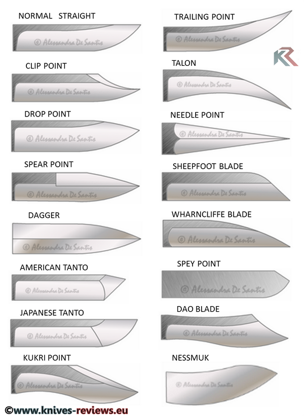 이러한 모양은 다른 종류에 비해 끝이 뾰족하고 위협적으로 보이며 찌르기가 용이하고 나이프의 중량도 줄어드는 효과가 있다 가장 많이 사용되는 타입이지만 단점으로는 칼끝이 쉽게 부러질 수 있다